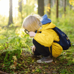 Instead of following a strict path, let your child’s interests lead the way. If they want to examine every tree bark or ant hill, embrace it! You can gently prompt their exploration by suggesting playful tasks, like finding five different types of leaves or spotting something soft, rough, and shiny. Encourage them to pause, look closer, and use their Explorer’s Kit tools to investigate their findings.